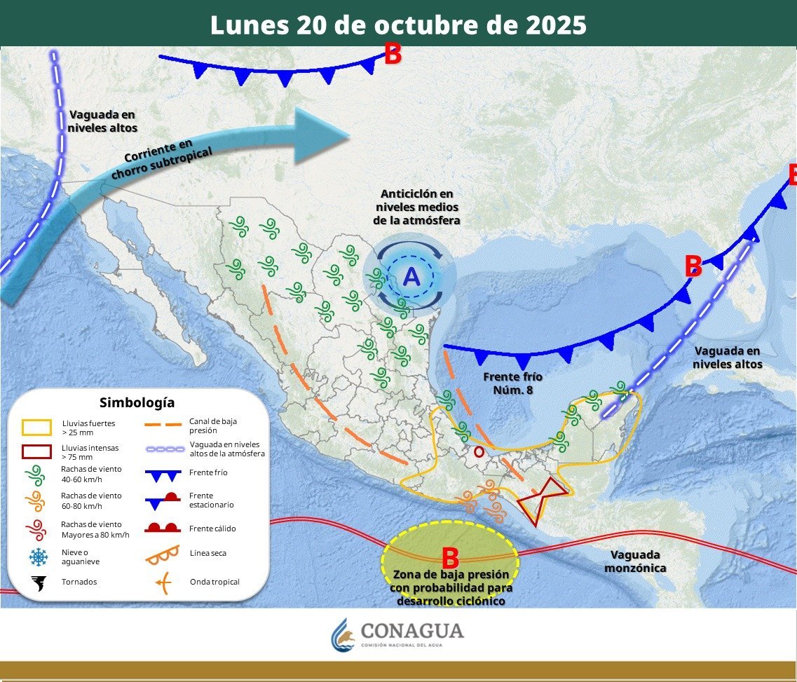 En ese sentido el reporte señala que el frente frío núm. 8 se desplazará sobre el golfo de México, en interacción con un canal de baja presión, que se extenderá sobre el occidente de dicho golfo y el sureste mexicano, además de una vaguada en altura sobre la península de Yucatán, generarán chubascos y lluvias fuertes a muy fuertes en la mencionada península, el oriente y sureste de la República Mexicana, pronosticándose lluvias puntuales intensas en zonas de Veracruz y Chiapas.