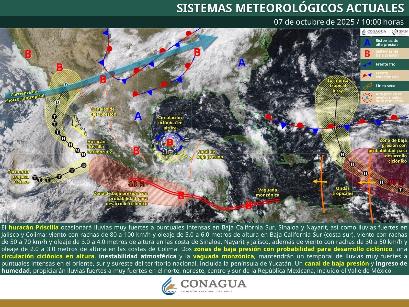 Ante esto se ha dado a conocer con el reporte diario que El huracán Priscilla de categoría 2 en la escala Saffir-Simpson se desplazará lentamente al sur de Baja California Sur, su circulación y bandas nubosas mantendrán la probabilidad de lluvias muy fuertes a puntuales intensas en Baja California Sur, Sinaloa y Nayarit, así como lluvias fuertes en Jalisco y Colima; además de rachas de viento de 80 a 100 km/h y oleaje de 5.5 a 6.5 metros de altura en Baja California Sur (costa sur); viento con rachas de 50 a 70 km/h km/h y oleaje de 3.0 a 4.0 metros de altura en las costas de Sinaloa, Nayarit y Jalisco; y rachas de viento de 30 a 50 km/h con oleaje de 2.0 a 3.0 metros de altura en las costas de Colima.
